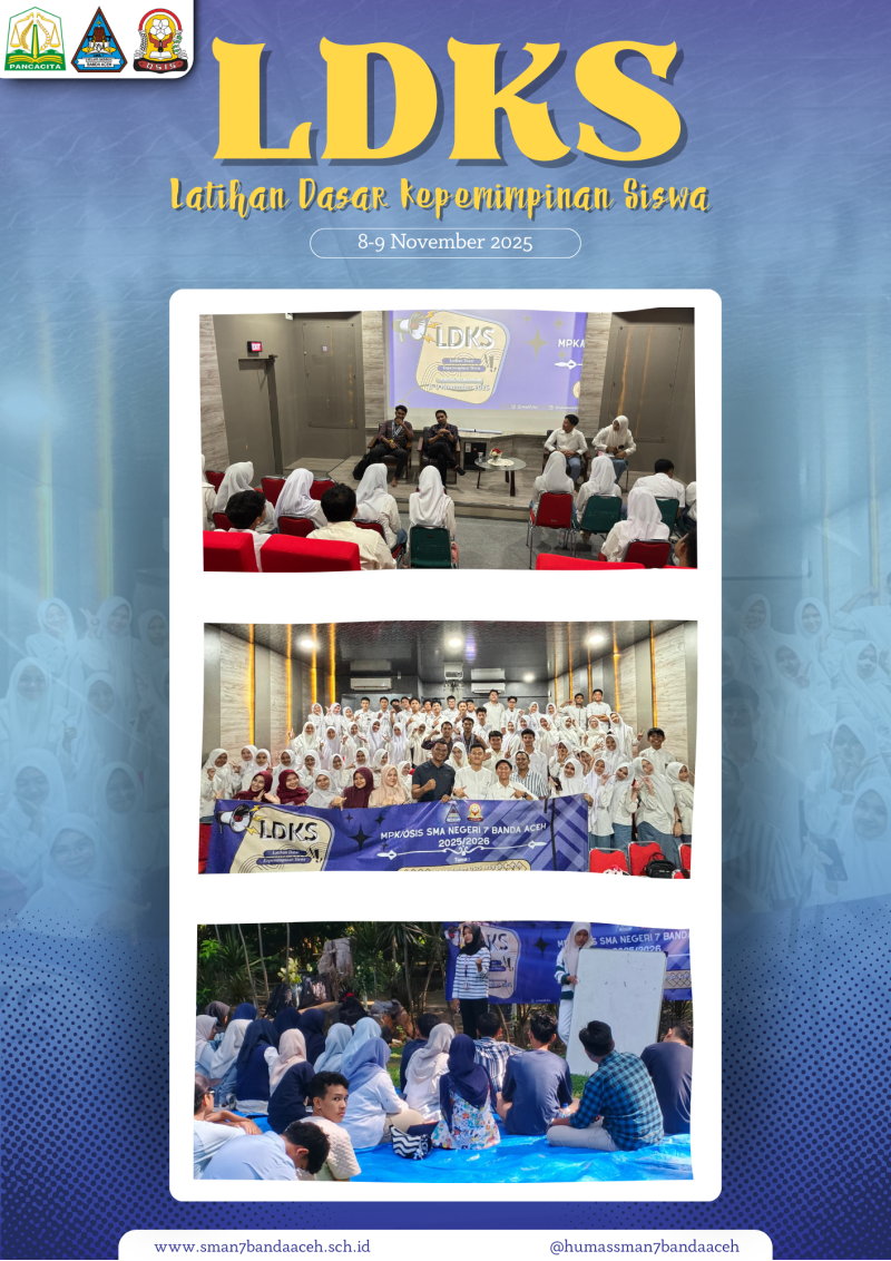 OSIS SMAN 7 Banda Aceh m menggelar Latihan Dasar Kepemimpinan Siswa (LDKS) Sabtu-Minggu, 8-9 Nopember 2025. Kegiatan yang bertema "kepemimpinan OSIS sebagai garda terdepan sekolah" ini digelar di Gedung Balai Pelestarian Kebudayaan (BPK Wilayah 1) Banda Aceh.